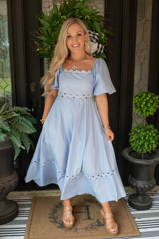 Blue Puff Sleeve Midi Dress