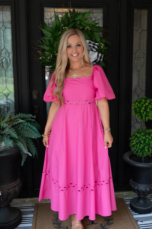 Pink Puff Sleeve Midi Dress