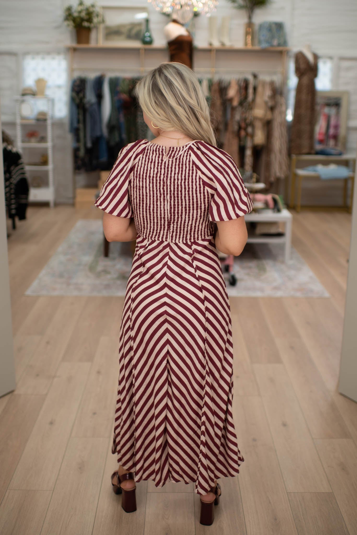 - A striped midi dress featuring a smocked bodice, short puff sleeves, and a deep V-neckline. Designed with chevron stripe placement on the skirt for a flattering effect.