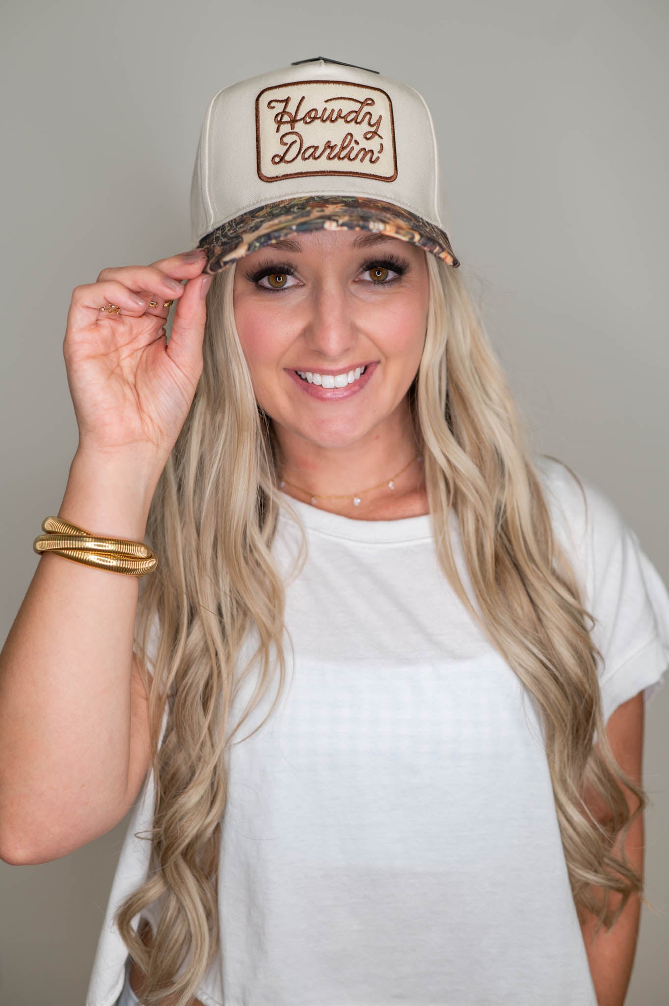 - Howdy Darlin' Embroidery Patch Cap - Camouflage Print Design - Howdy Darlin' Text Embroidery Patch - 5-Panel Two-Tone Trucker Hat - 100% Cotton **One Size Fits Most with Adjustable Snapback Closure **