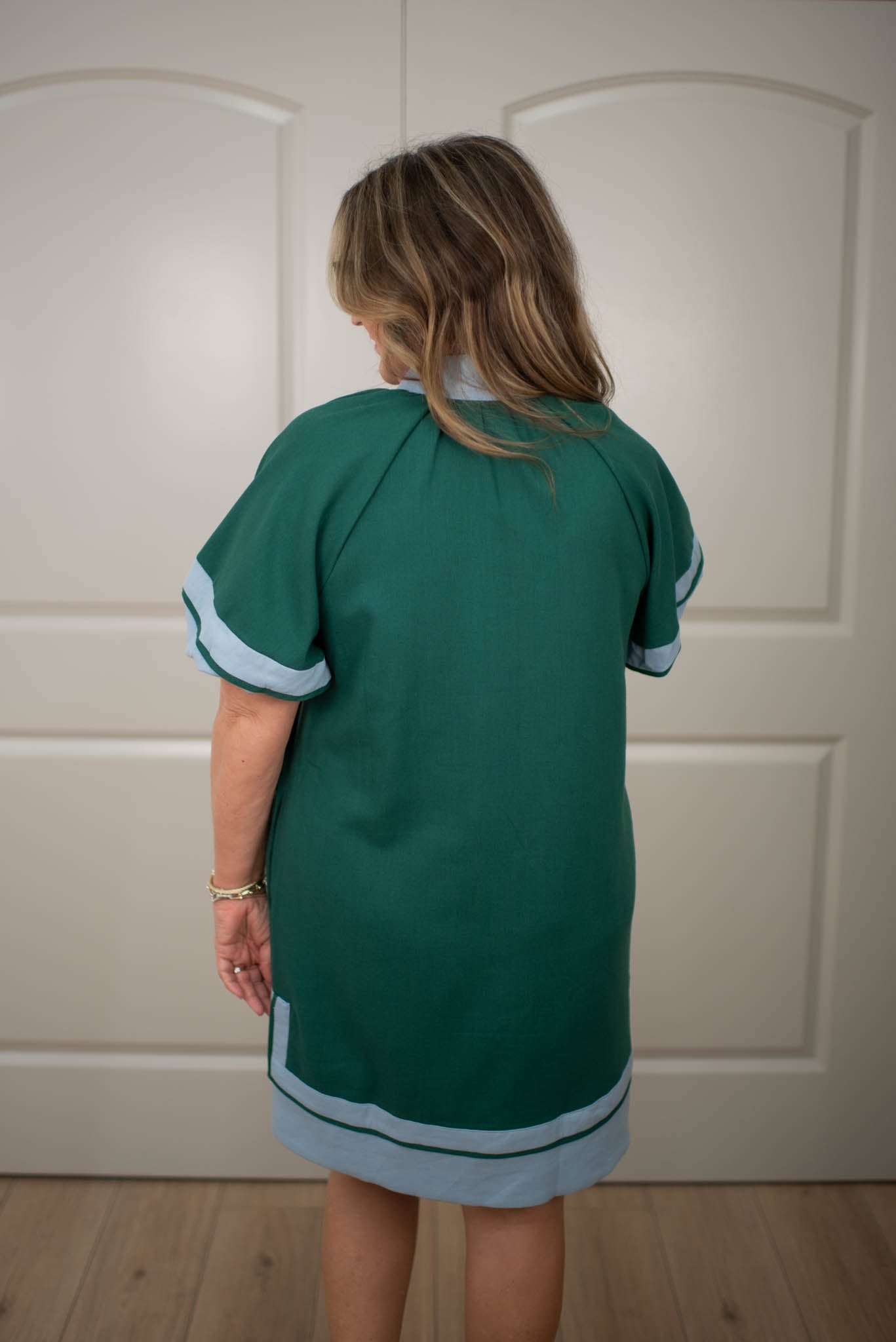 - Solid contrast accented short lantern sleeves pullover mini dress with slit hem featuring a high neck split collar band. Lined. Woven. Non-sheer Mid weight.