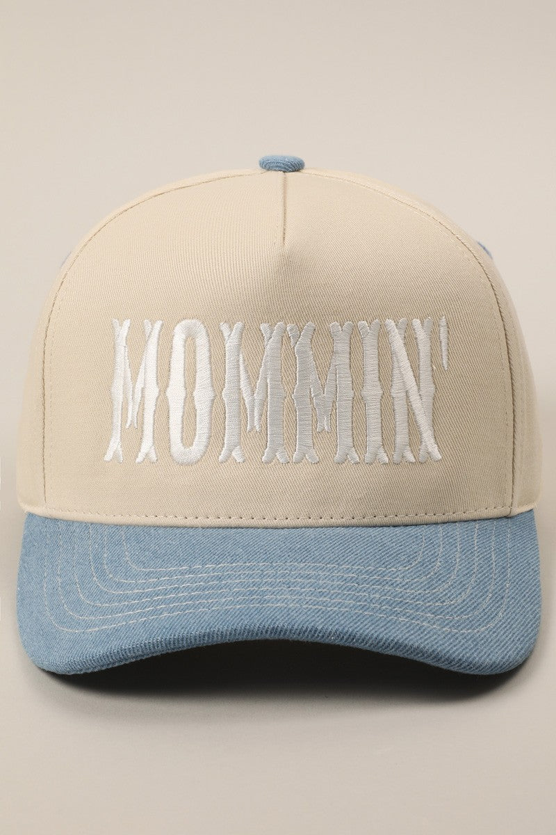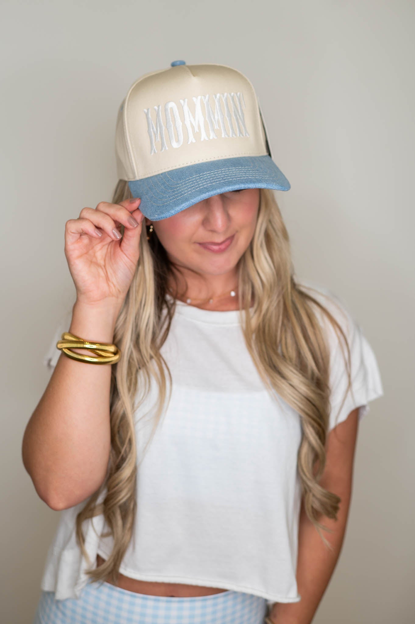 - "MOMMIN'" Letter Embroidery - 5-Panel Two-Tone Trucker Hat - 100% Cotton Canvas Hat - Embroidered In the USA
